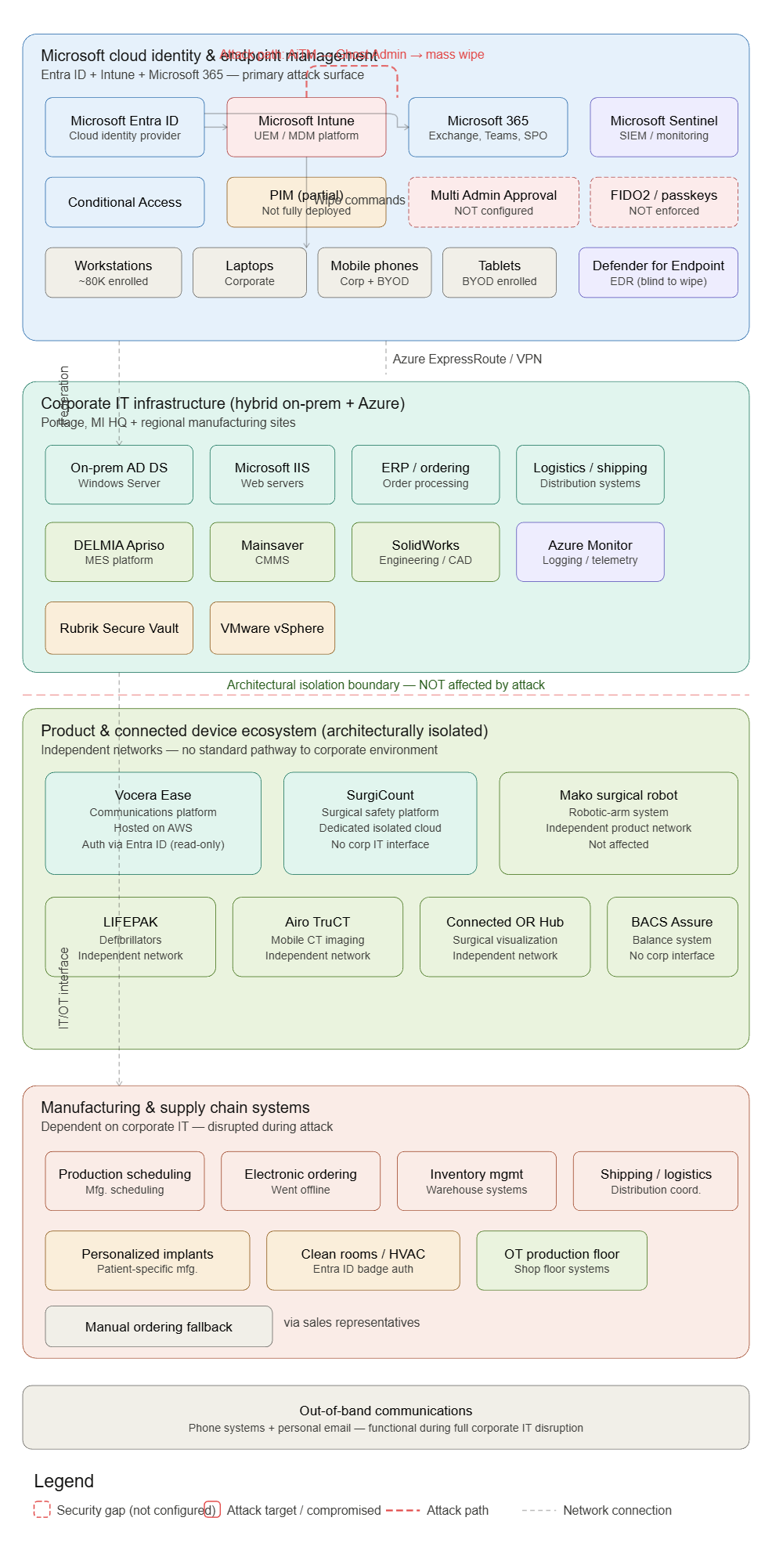 | Four-layer network architecture diagram showing the cloud identity layer (Entra ID, Intune, M365), hybrid on-prem infrastructure, architecturally isolated medical device ecosystem, and manufacturing/supply chain systems with attack path overlay. | Network Diagram | Download |